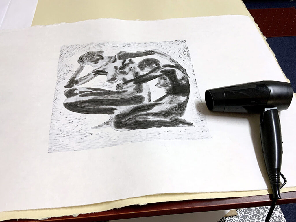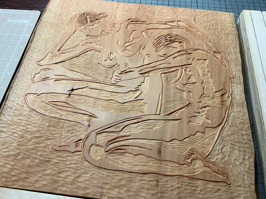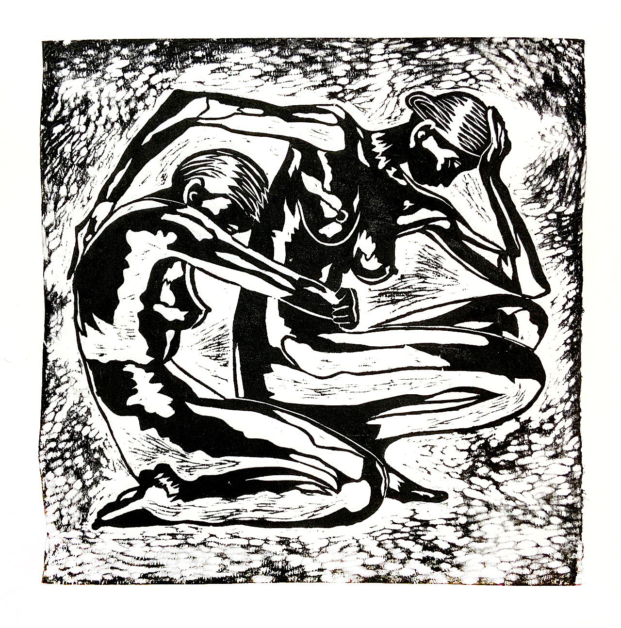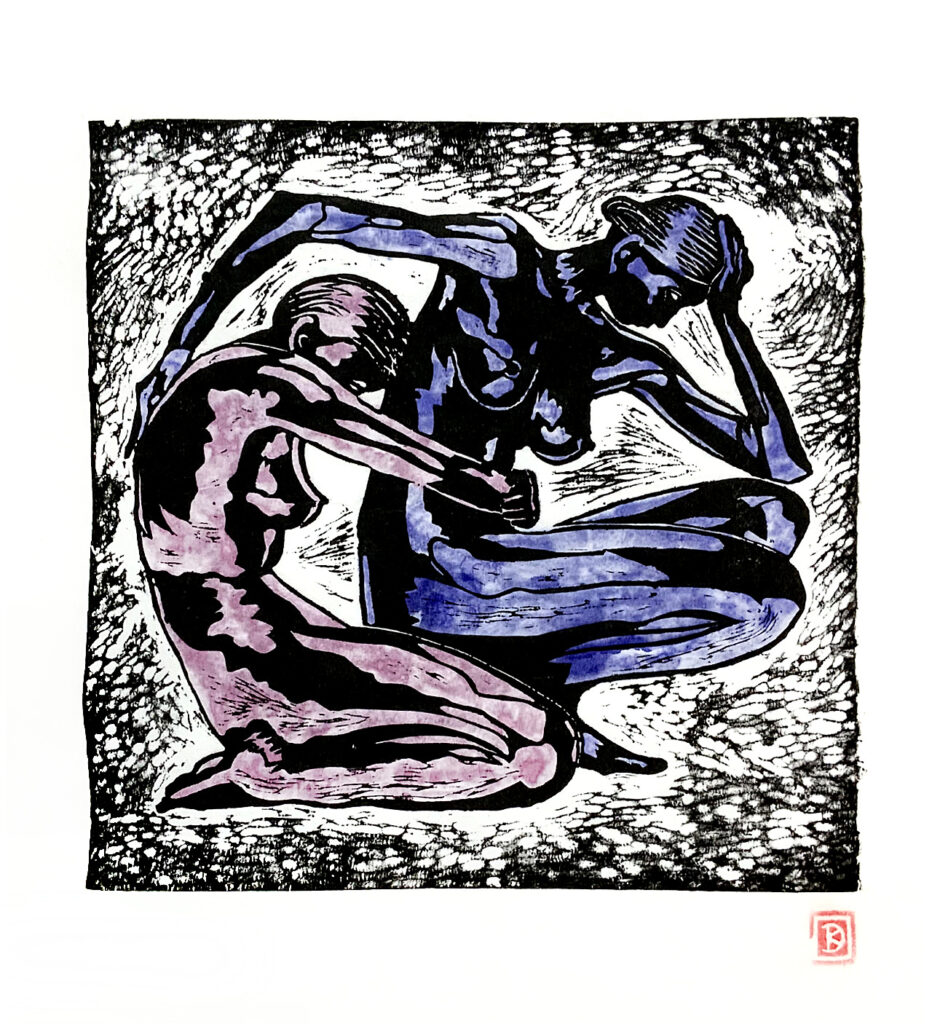Wieder war es der Bildband des Fotografen GUIDO ARGENTINI als Auslöser zur Idee dieses Holzschnittes: r hatte Tänzerinnen als Akte mit komplett silbrig gefärbter Haut in kontrastierender Beleuchtung sehr ästhetisch in Pose gesetzt – nur Schwarz-Grau-Töne ergaben sich – und die Schönheit zweier wortlos kommunizierender, weiblicher Körper, einander nah und zugeneigt, doch auch offenbar wie bedrückt, wie in schmerzender Trauer, bildete eine berührende Symbiose.