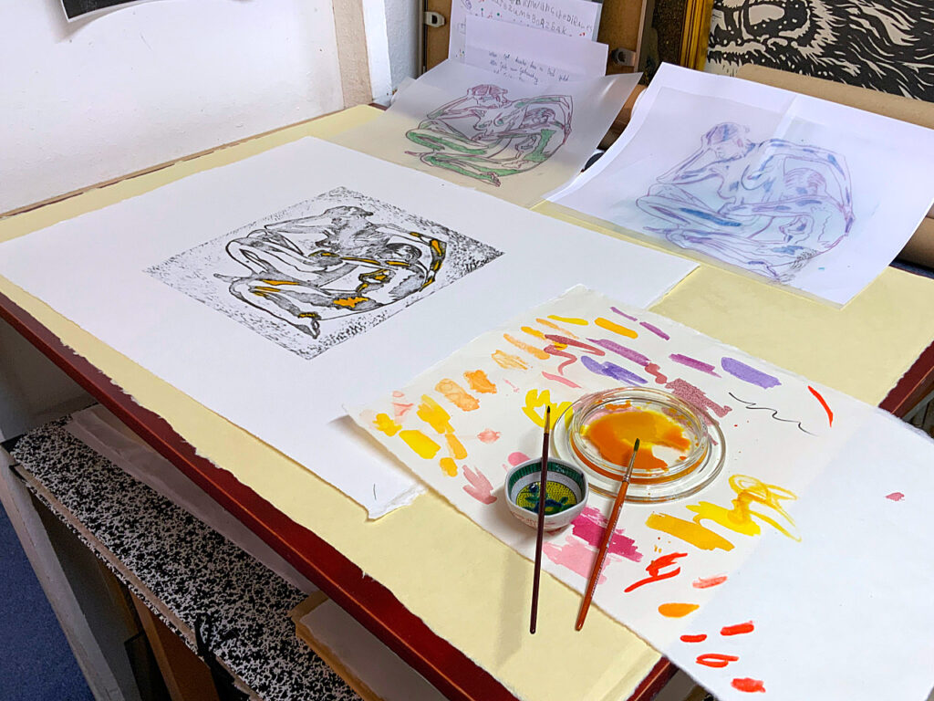 Polychromer Holzschnitt, aber nur eine Kirschbaumvollholzplatte; mit japanischer Tusche handgedruckt auf japanisches washi; rückseitig nachkoloriert mit Aquarellfarben (Ura zai shiki-Technik); Blattgröße: 48x 66 cm (H x B)