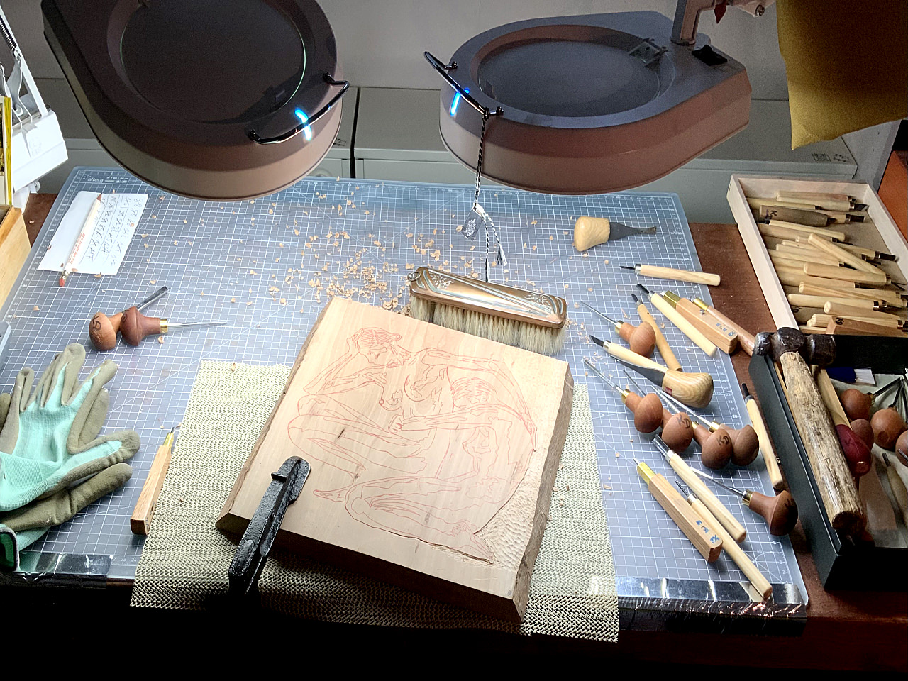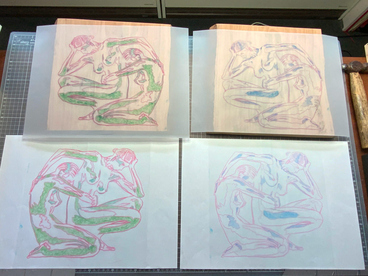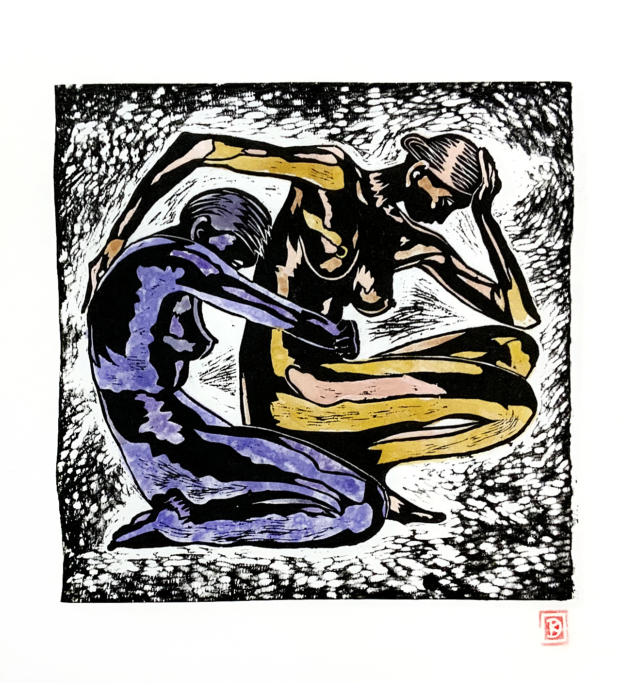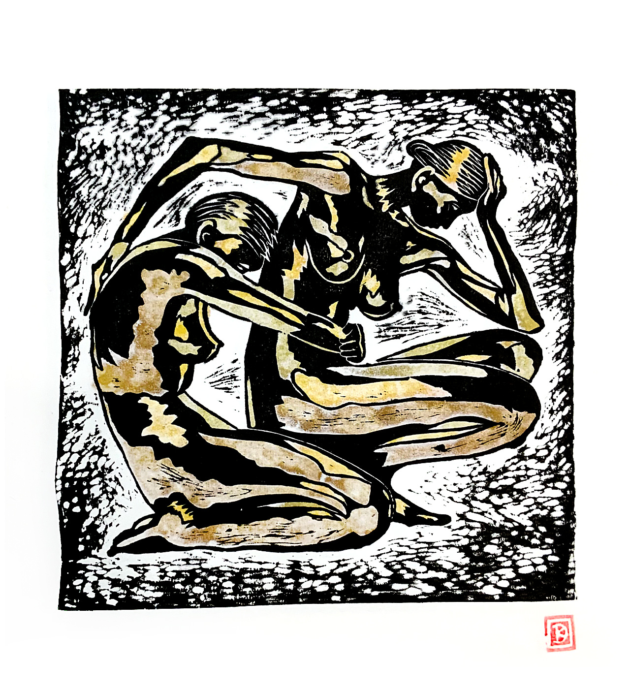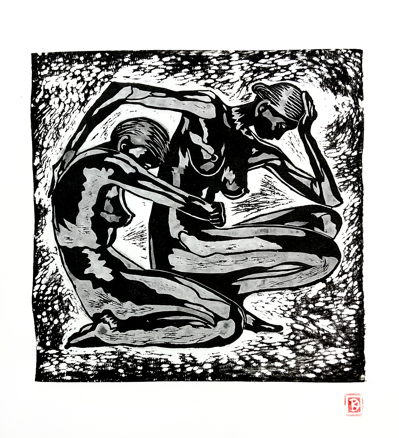 Wieder war es der Bildband des Fotografen GUIDO ARGENTINI als Auslöser zur Idee dieses Holzschnittes: r hatte Tänzerinnen als Akte mit komplett silbrig gefärbter Haut in kontrastierender Beleuchtung sehr ästhetisch in Pose gesetzt – nur Schwarz-Grau-Töne ergaben sich – und die Schönheit zweier wortlos kommunizierender, weiblicher Körper, einander nah und zugeneigt, doch auch offenbar wie bedrückt, wie in schmerzender Trauer, bildete eine berührende Symbiose.