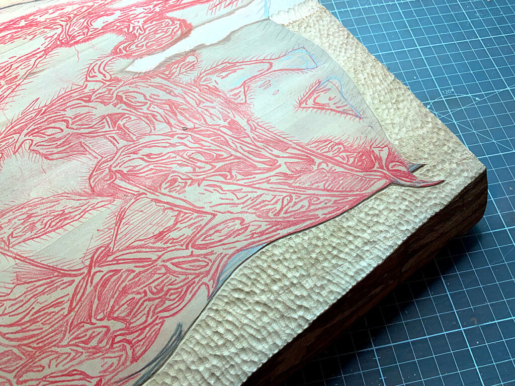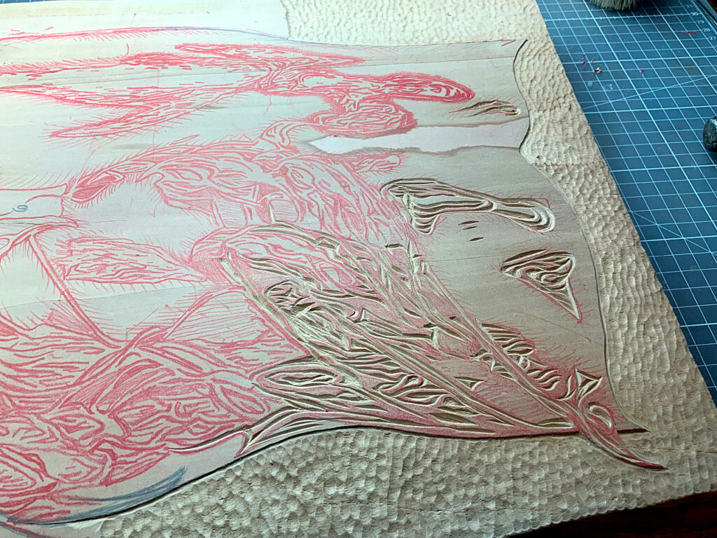 Polychromer Holzschnitt, aber nur eine Birnbaumvollholzplatte; mit japanischer Tusche handgedruckt auf japanisches washi; vorderseitig koloriert mit Acrylgold, rückseitig nachkoloriert mit Aquarellfarben (Ura zai shiki-Technik); Blattgröße: 66 x 48 cm (H x B)