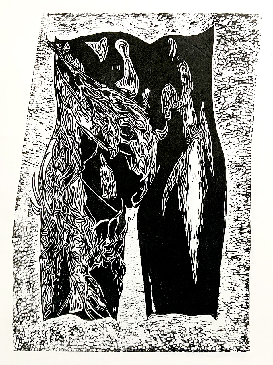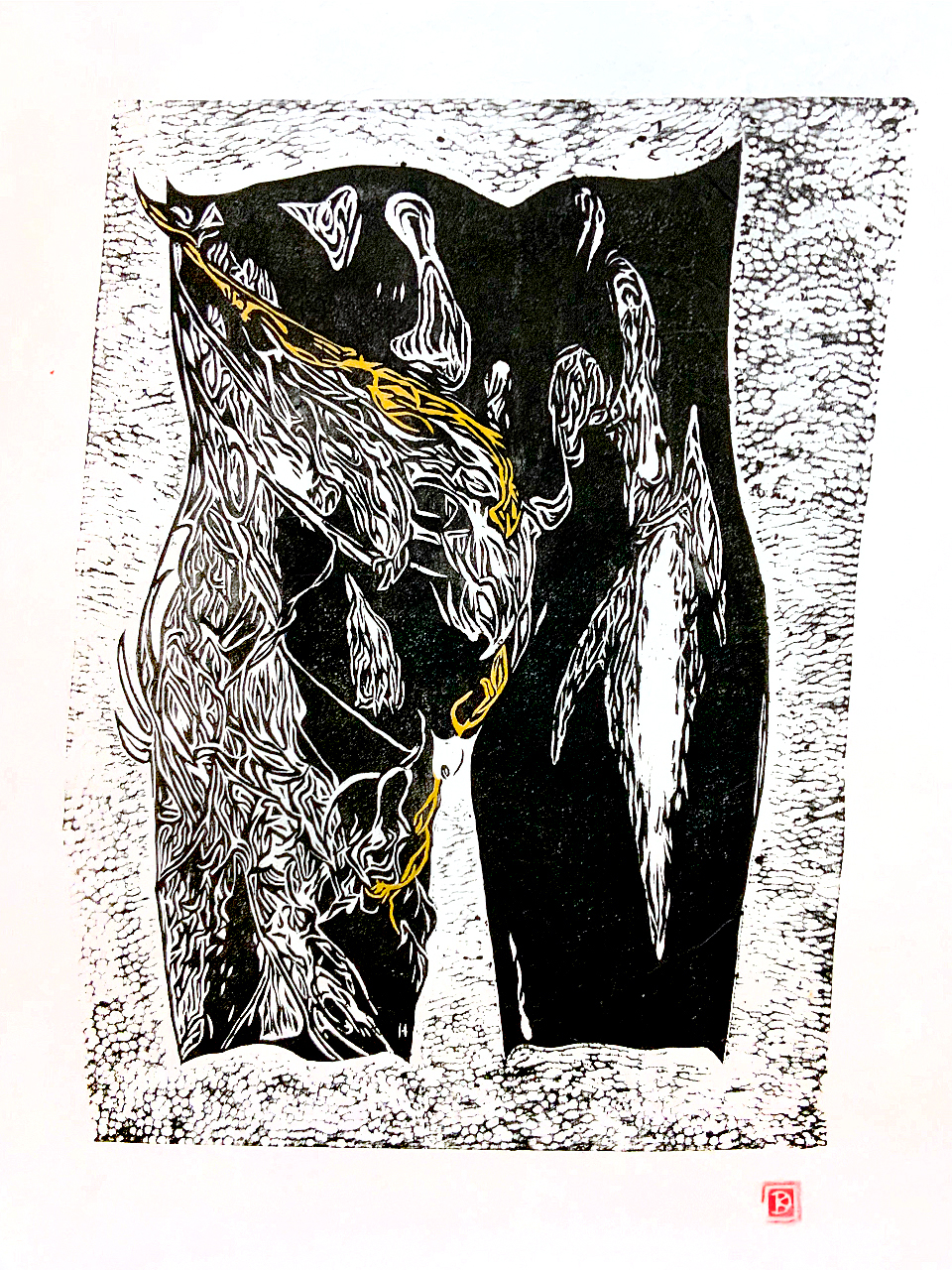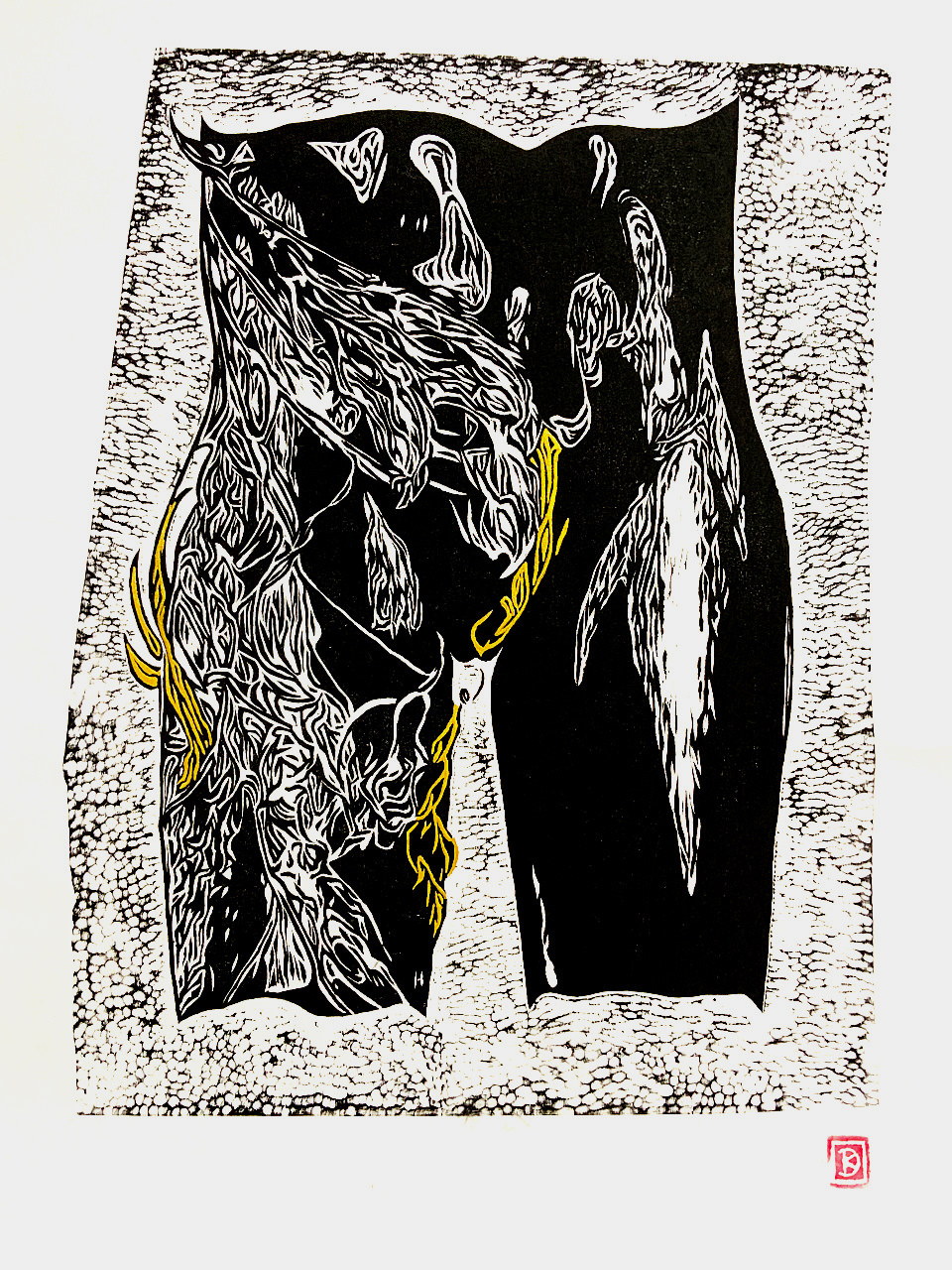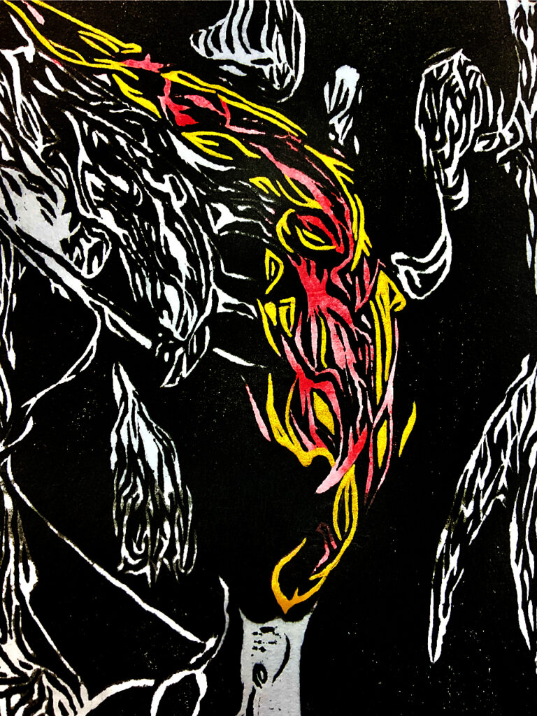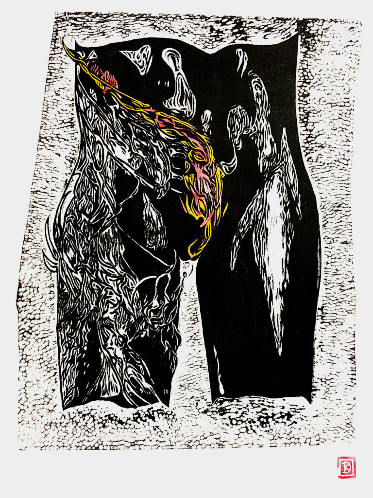 Bekannt aus der griechischen Mythologie, ist die „Medusa“ gleichbedeutend mit einer gefürchteten Gottfrau: Beim bloßen Anblick ihres schlangenumrankten Hauptes werde der Betrachter auf der Stelle versteinert! Im übertragenen Sinne könnte man es auch so verstehen, daß der Medusenanblick solchermaßen den Erblickenden verzaubert, daß er schier „gelähmt“ wird. Und so erdachte ich mir als Konzept für diesen Holzschnitt den schlangenähnlich umrankten Leib/Schoß einer solchen Medusa, die mit ihrer erotischen Ausstrahlung reihenweise den männlichen Voyeur fasziniert und dabei sogleich paralysiert.