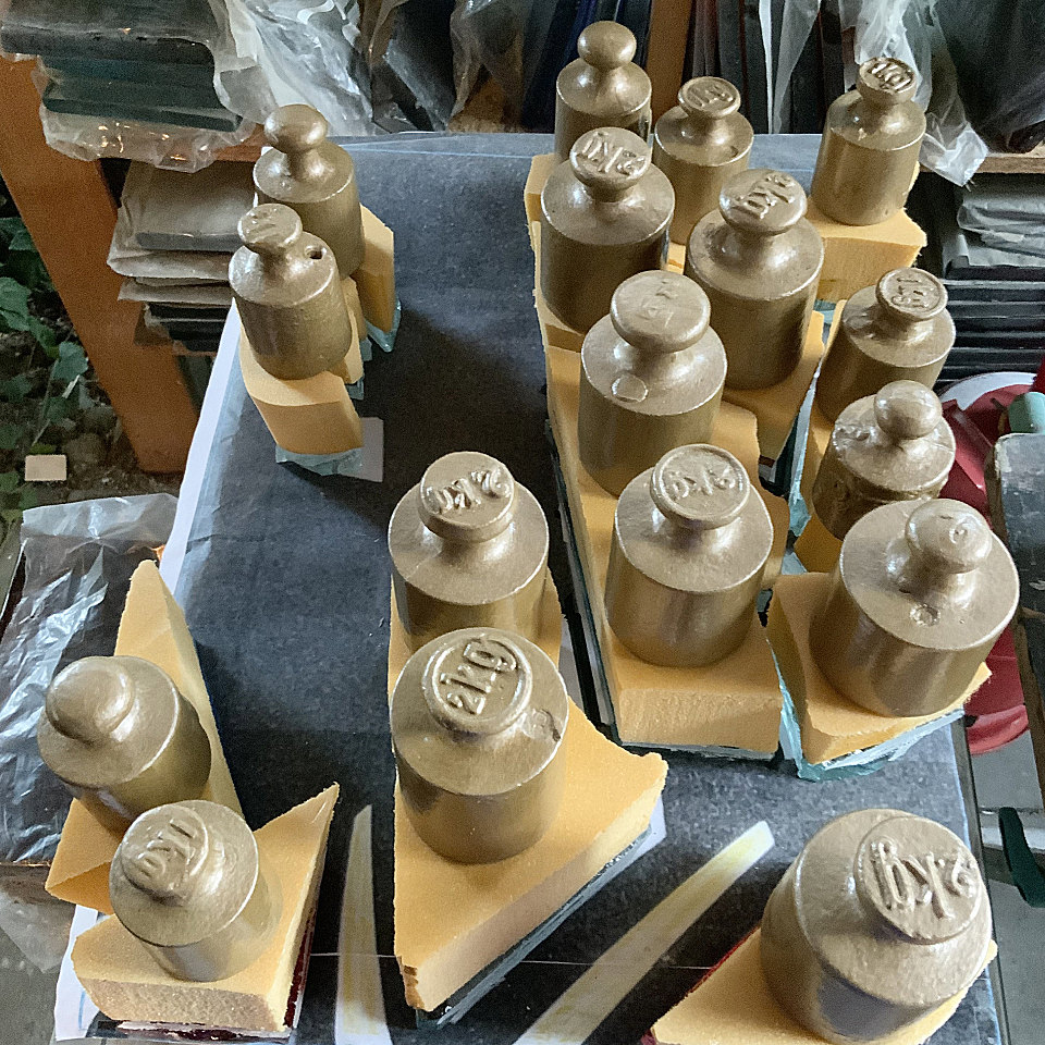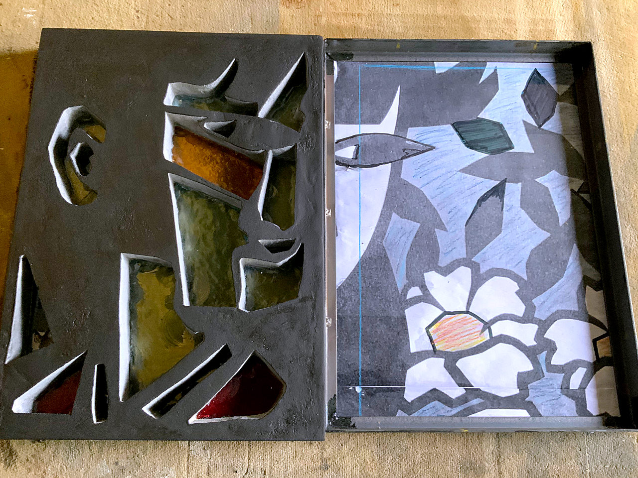 Dallglas, eingefasst von Hartbeton, rückseitig im Stahlrahmen verstärkt, Maße 62 x 45 x 6 cm (H x B x T); Gewicht 28 kg.