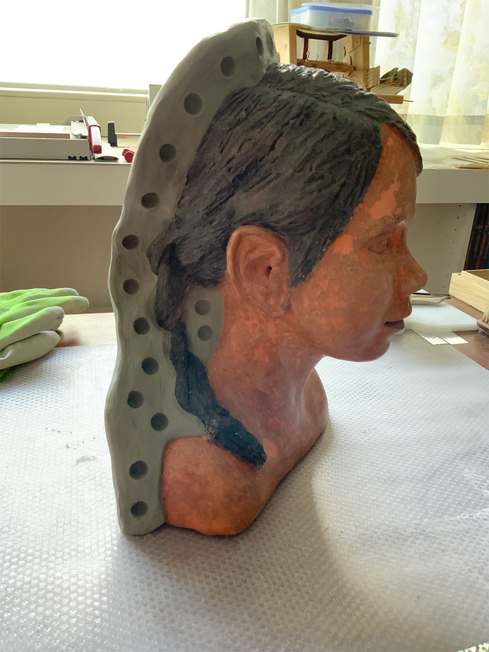Für die mühevoll nachbearbeitete Büste Gretas wählte ich folgenden Formenbau: eine zweiteilige Silikonform kombiniert mit einer dreigeteilten Gipskappe. Die Silikonform an sich war mit erheblichen Problemen behaftet, da die Zöpfe Gretas zu sogenannten „Hinterschneidungen“ führten und eine Art „Druckknopftechnik“ sollte die nur zweiteilige Form ermöglichen.