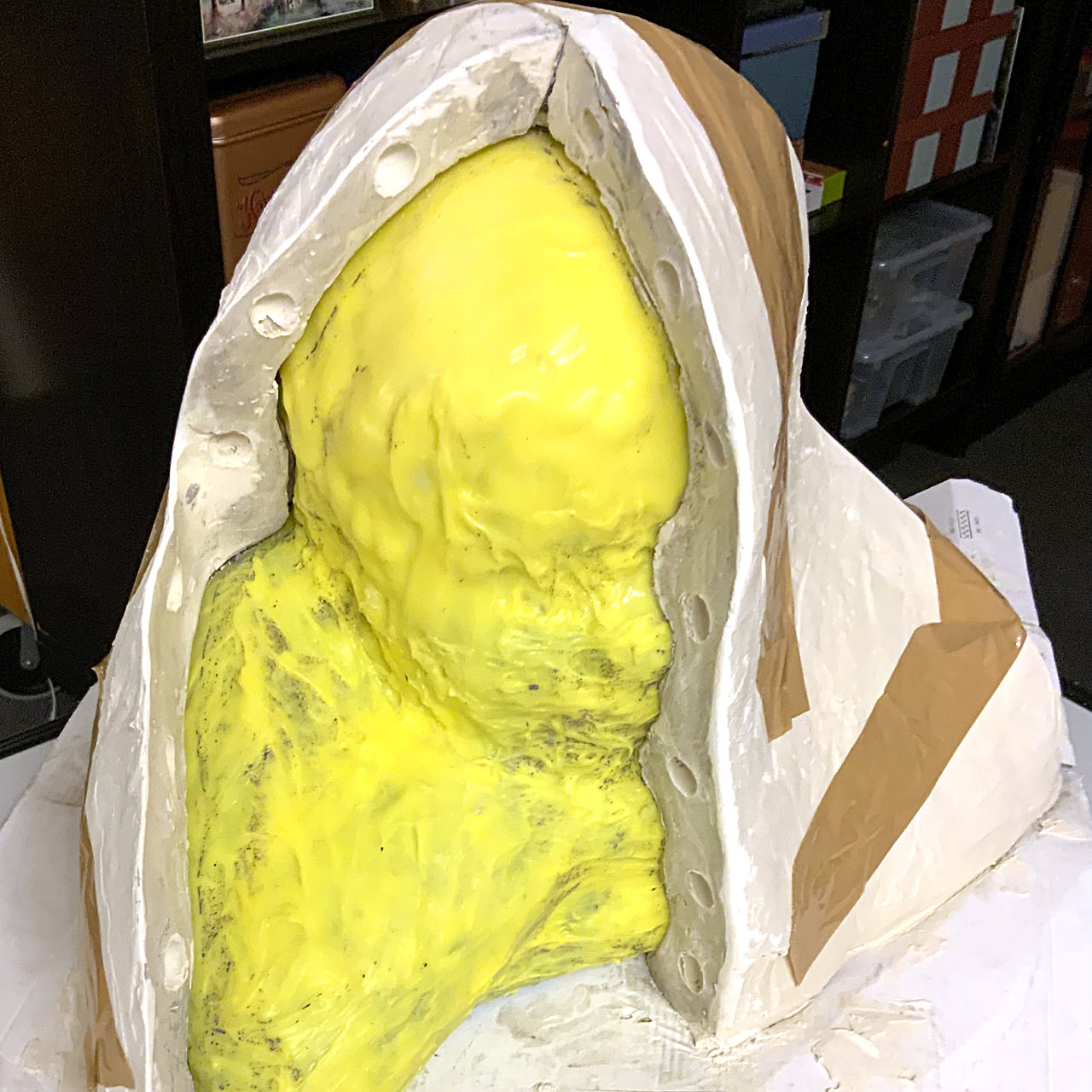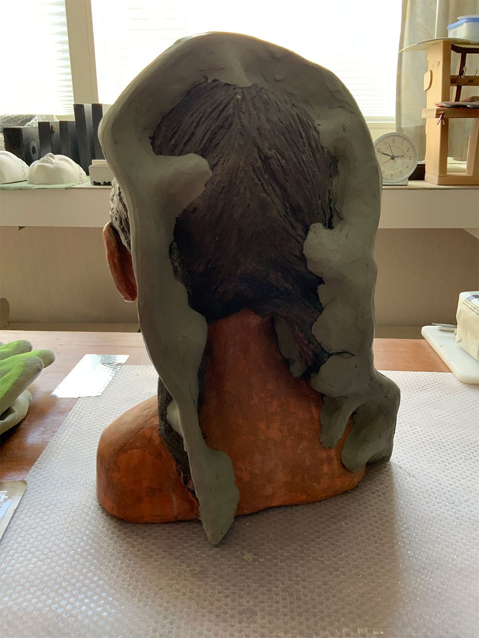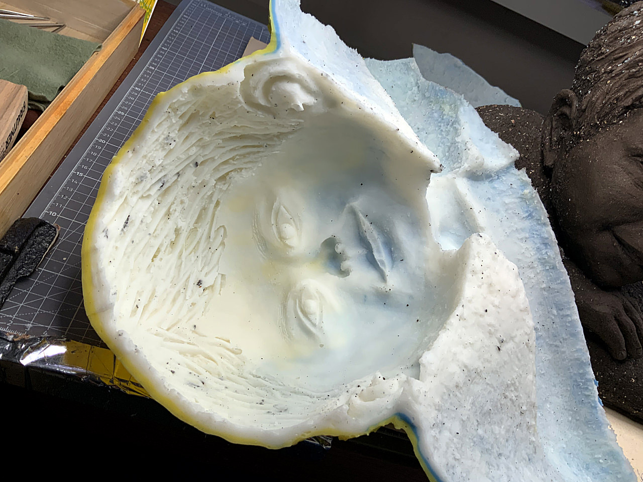 Aber dies würde ich heute definitiv einfacher gestalten, da es bei einer einfachen Form wie dem gezeigten Tonkopf auch mit einem kompletten Silikonüberzug gelingt, das Modell herauszulösen – oder mit nur einem kleinen Hilfsschnitt an der Rückseite.