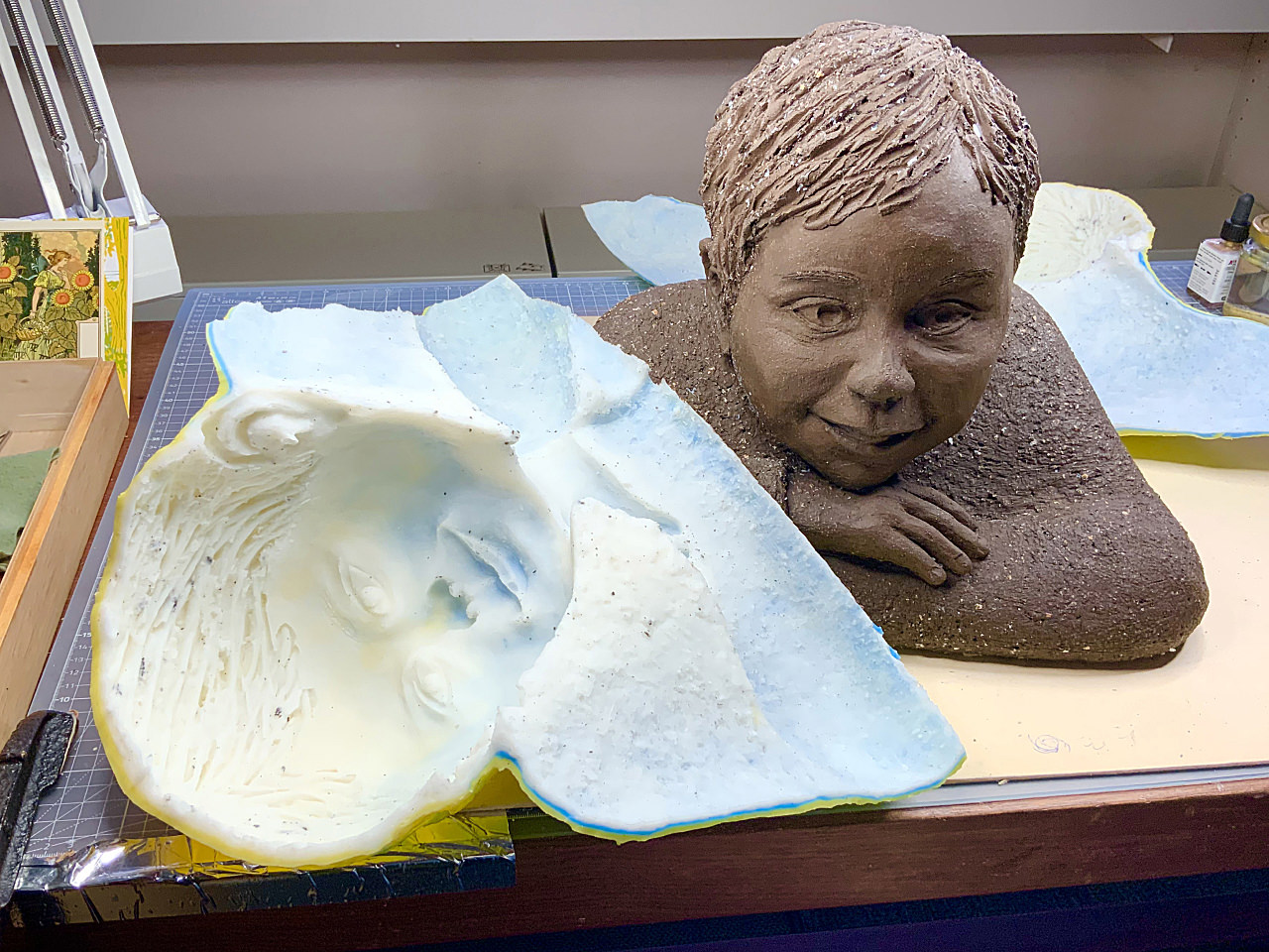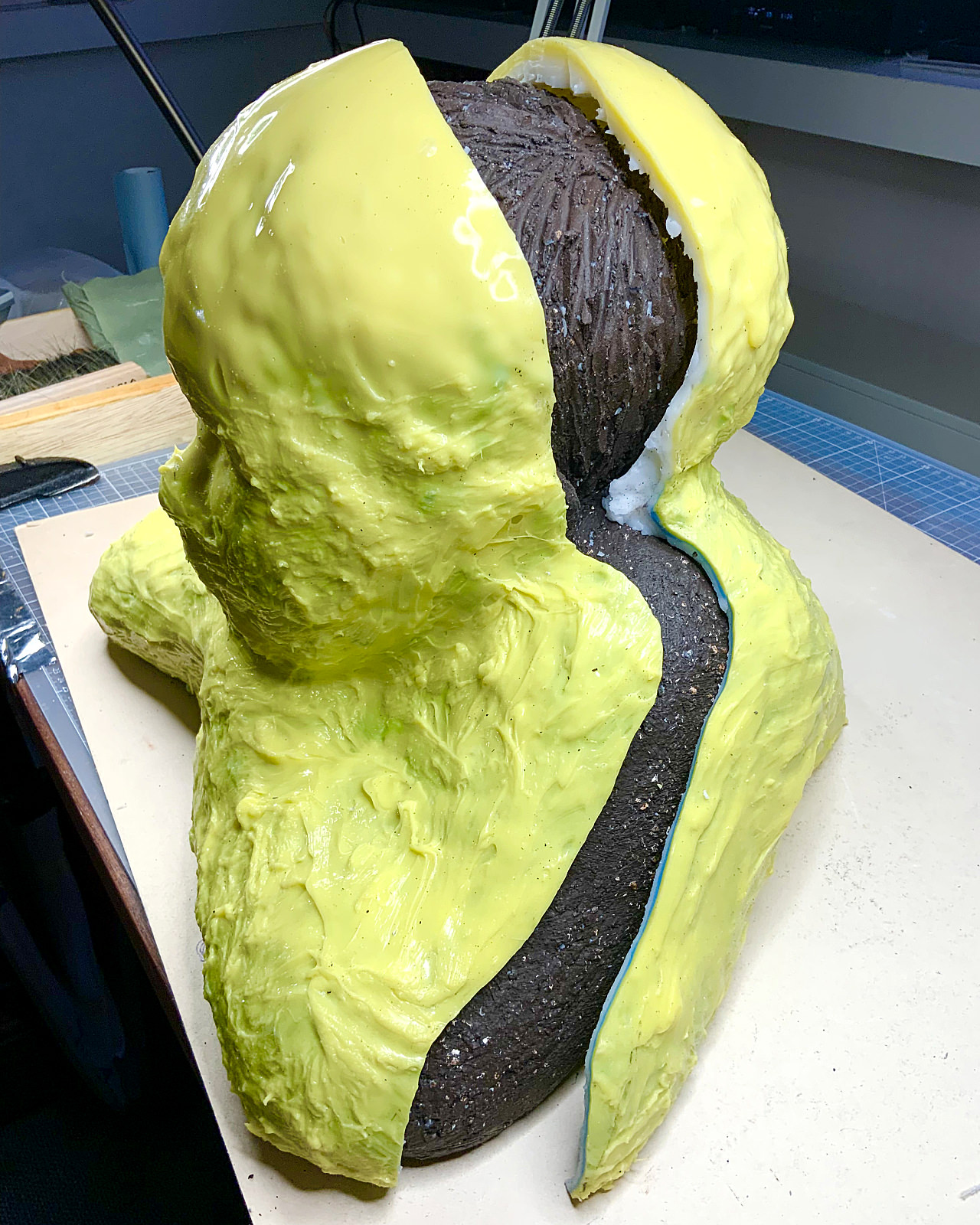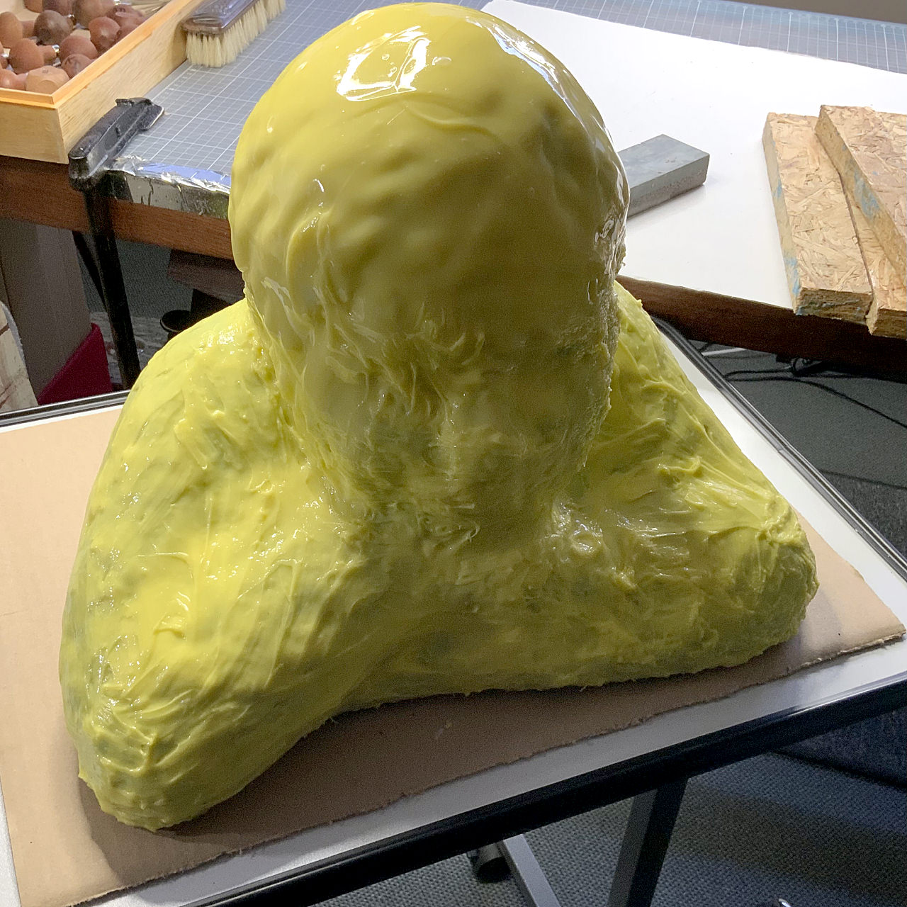Aber dies würde ich heute definitiv einfacher gestalten, da es bei einer einfachen Form wie dem gezeigten Tonkopf auch mit einem kompletten Silikonüberzug gelingt, das Modell herauszulösen – oder mit nur einem kleinen Hilfsschnitt an der Rückseite.