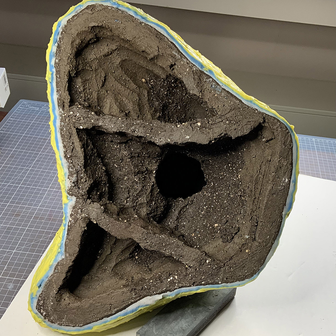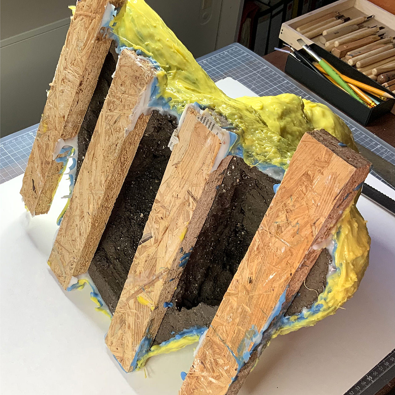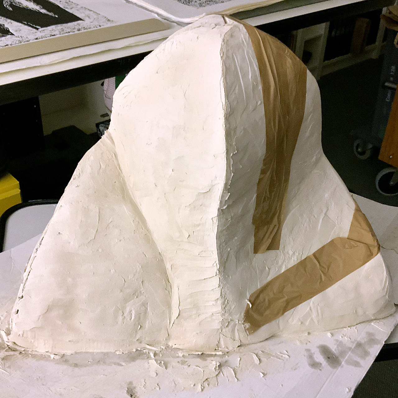 Die separiert geformten Gipskappen, begrenzt durch die wallartig aufgebauten Gipsbinden, wurden als drei große Mulden mit einfachem, schnellhärtendem und preiswertem Elektrikergips aufgebaut und so entstand der zusammenhängende Block, der sich auf einem Heizkörper in nur wenigen Tagen trocknen ließ.