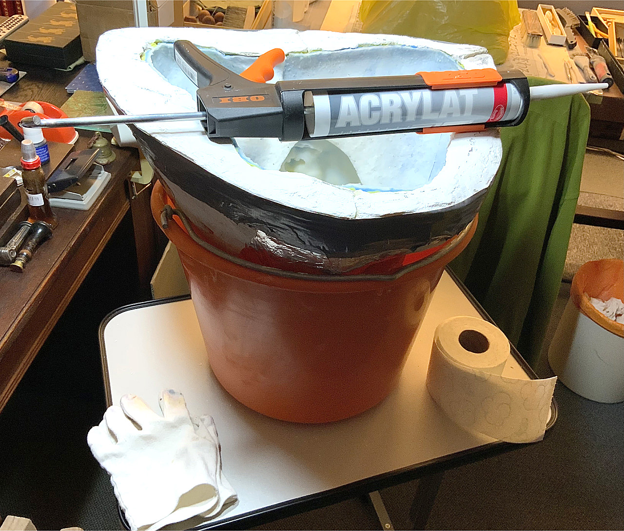 Auch den umlaufenden feinen Spalt zwischen den Gipskappen habe ich überklebt, so daß KEIN FLIESSGIPS AUSTRETEN sollte, aber einen Minispalt kann man einfach nicht ganz vermeiden. Statt der „Verpflasterung“ praktizierte ich kürzlich noch eine andere Variante, die Verschmierungen der Gipskappen äußerlich verhindert: umwickelt man die gut schließenden Kappen ganz fest mit Frischhaltefolie mehrfach, so entsteht ebenfalls eine sehr gute Fixation, so dass der Druck der einzugießenden Gipsmasse die Form nicht auseinanderdrängt und so auch nicht zu vermehrtem Fehlaustritt an den Kontaktstellen der Silikonform führt! Nun wird die Gießform dann aufgestellt – gesichert mit Holzwolle in einem Baueimer.
