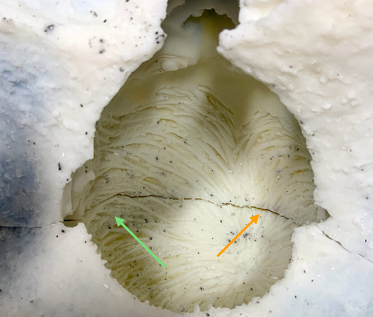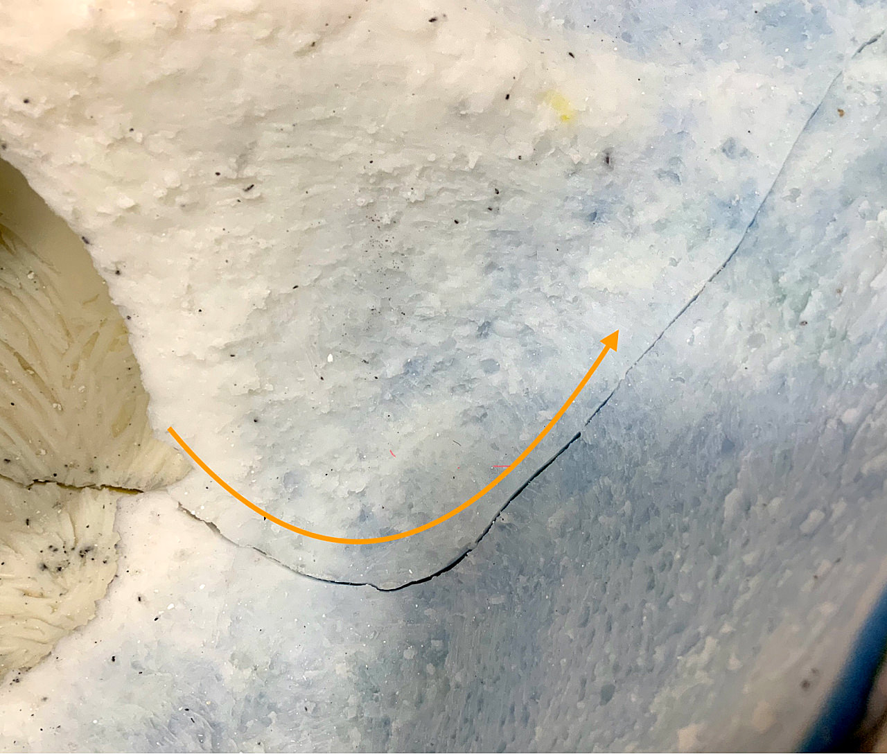 Wenn diese Gipsschicht nicht mehr glänzt, wird die neue Charge in etwa gleicher Menge angemischt, umgerührt und eingegossen, dann gedreht und gewendet wie bei der ersten Charge. Diese Strategie wird fortgeführt bis zum Erreichen einer geschätzten Wandstärke von 10–15 mm.