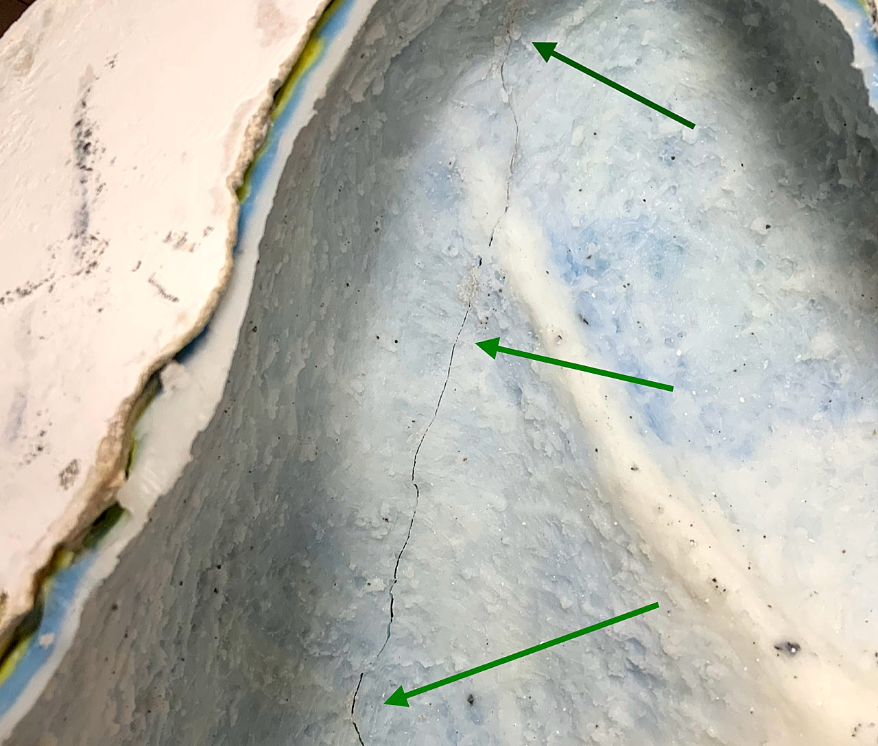 Defekte Stellen durch Blasenbildung lassen sich am besten durch Zufügen des gleichen Gipses im feuchten Zustand des Gipsgusses ausgleichen, Grate aber besser in trockenem und dann mit 400er Schleifpapier. Und natürlich kann man auch die Strategien mischen, indem man die Stellen mit destilliertem Wasser anfeuchtet und schleift.