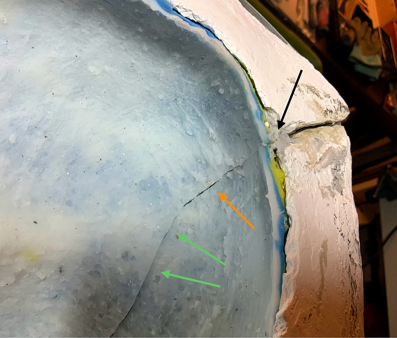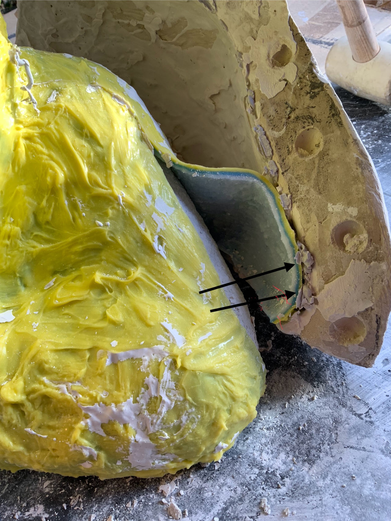 Feine Gipsaustritte aus den Silikonformteilen und der äußeren Gipshülle sind normal, ziehen aber eine Reinigung der Formteile zwingend nach sich, denn sonst werden diese nicht mehr exakt aufeinander passen und noch viel mehr Gips ausfließen.