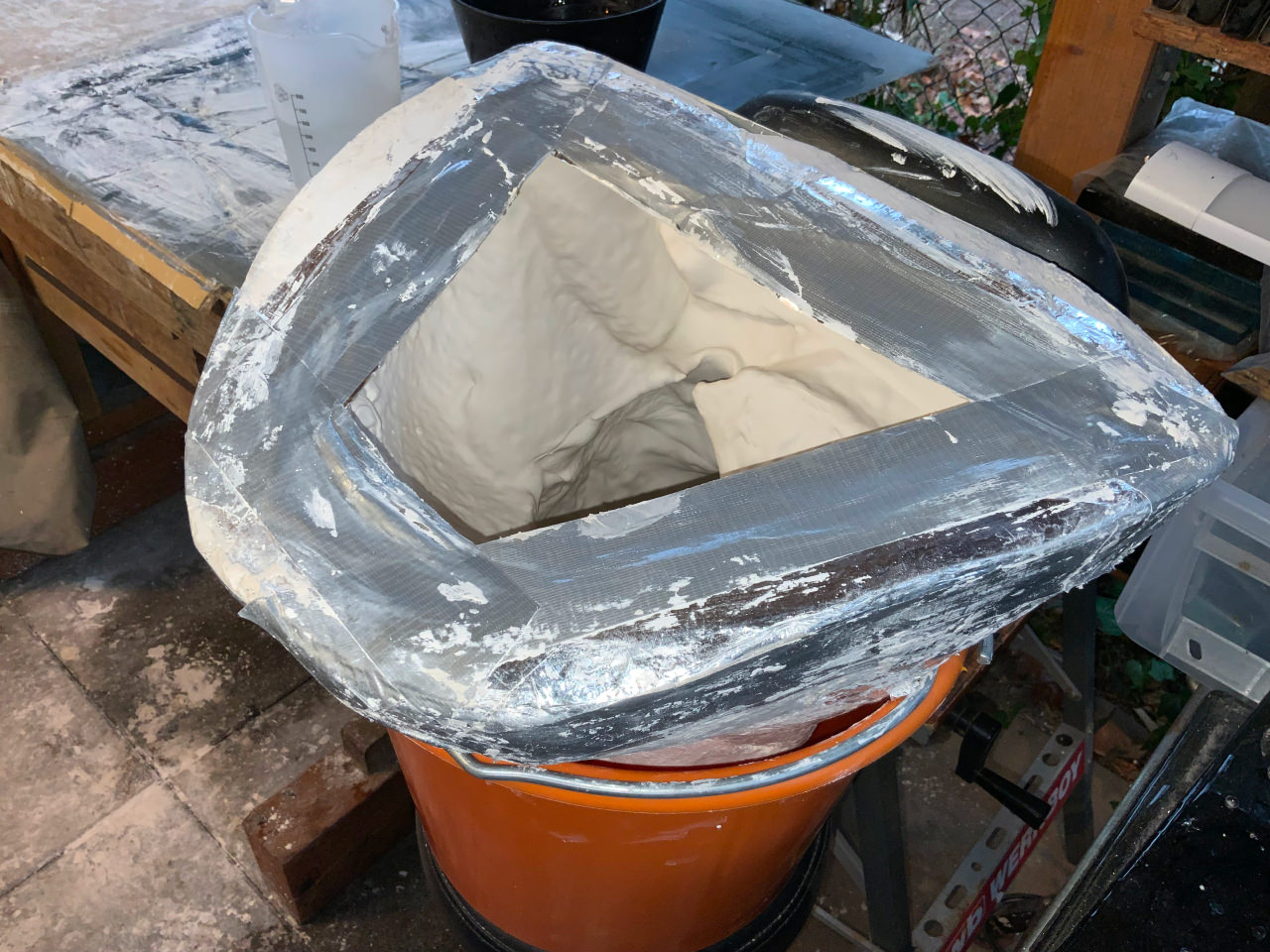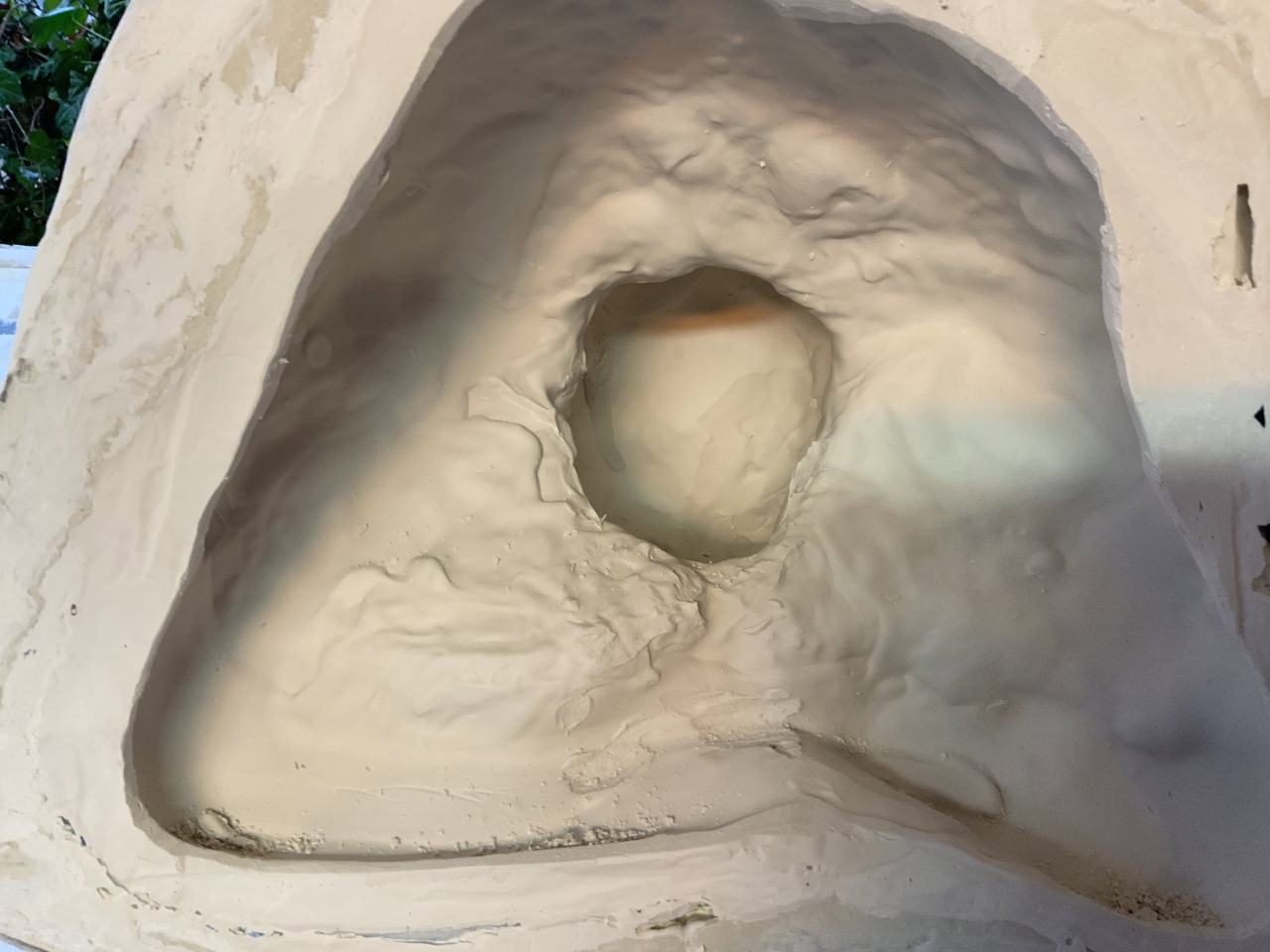 Dieser steht erst an, nachdem sowohl die innere Silikonform als auch die äußeren Ummantelung mit einfachem Gips gefertigt sind. Vor dem Einbetten der Silikonform in die Gipshülle erwies sich als hilfreich, sie mit Vaseline Spray zu besprühen: so löst sie sich später recht leicht aus der paßgenauen äußeren Gipsummantelung.