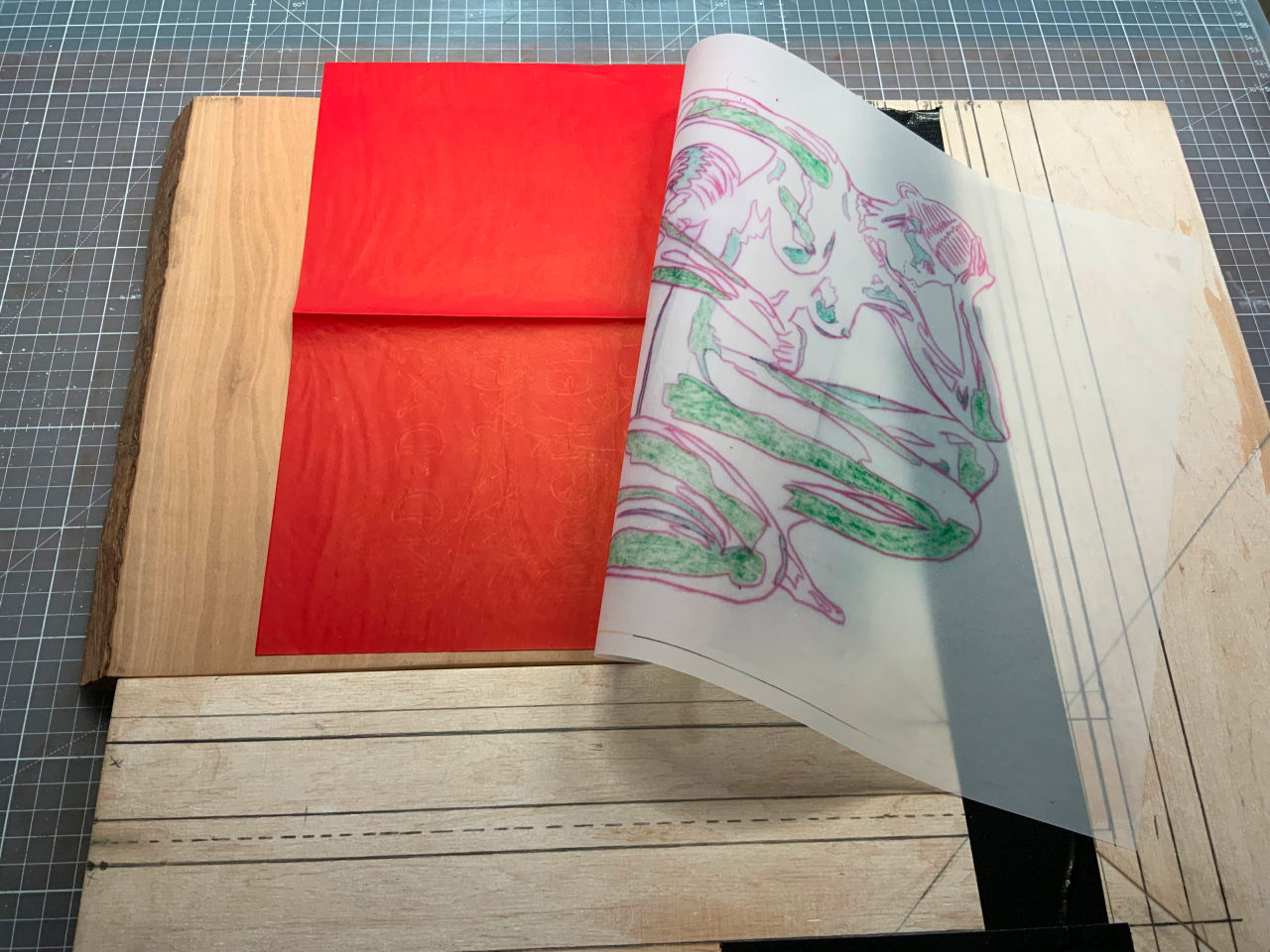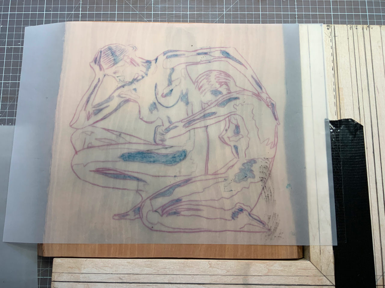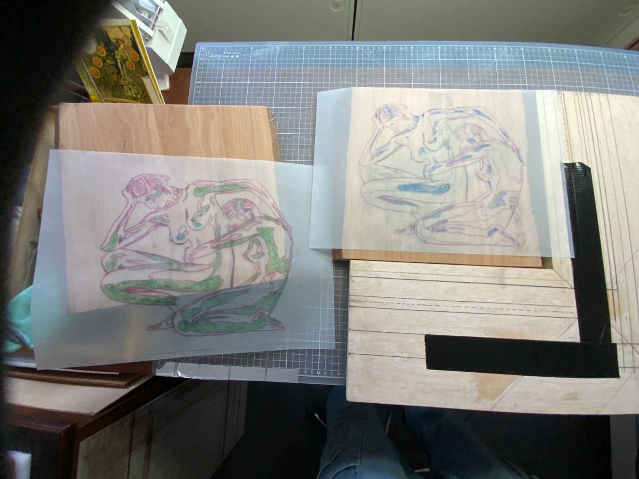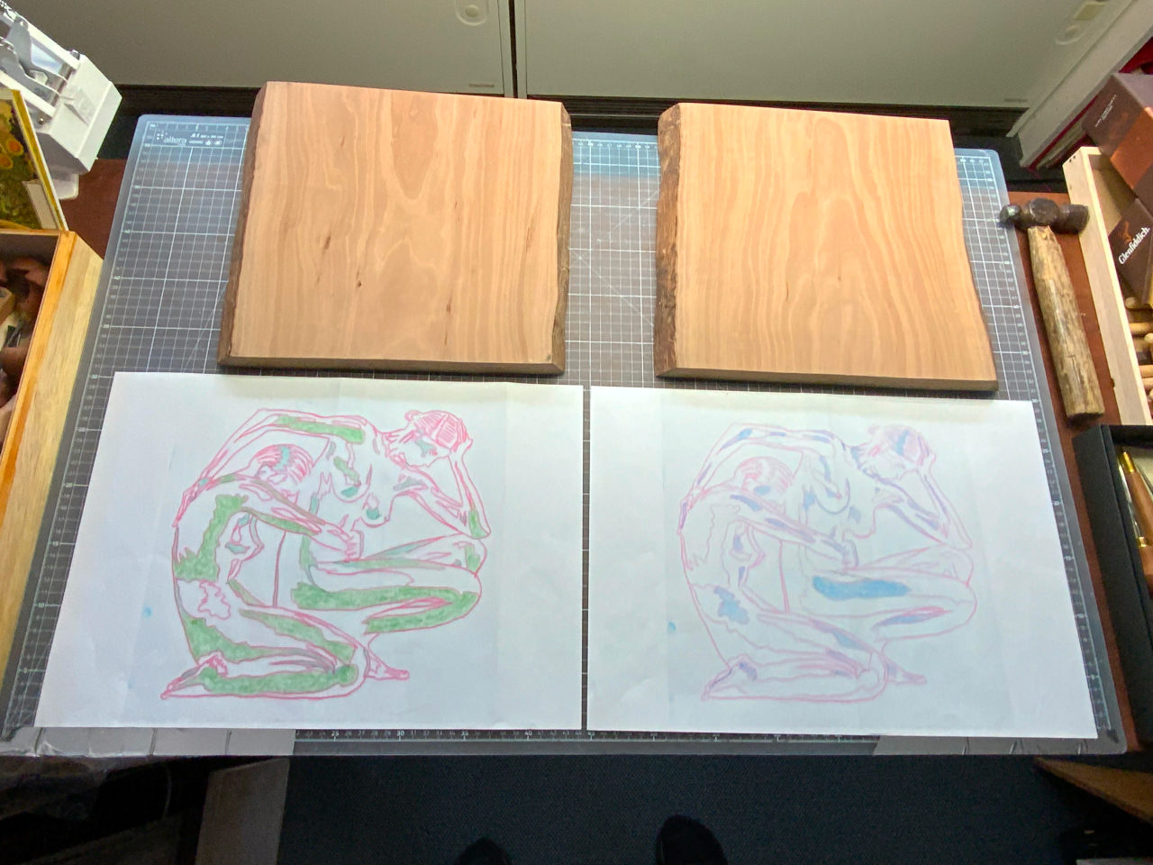 Für beide (auszuwechselnde) Druckstöcke müssen die präzise übereinander gelegten, spiegelverkehrten Vorlagen eine passende Holzabdeckung gewährleisten.