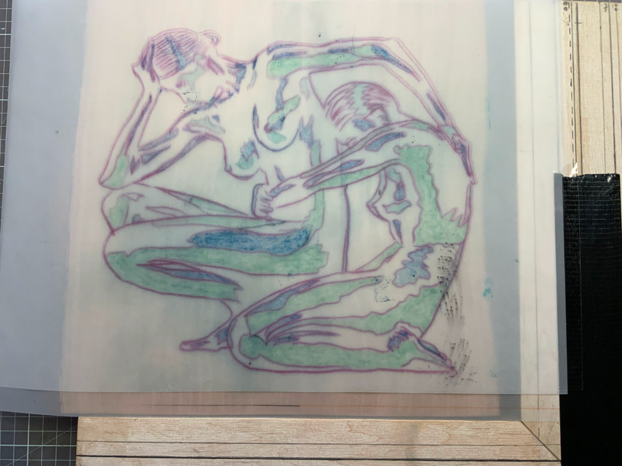 Man sollte den primären Druck mit der japanischen Tusche (Sumi) oder den neuartigen wasserlöslichen Tiefdruckfarben mindestens eine Woche gut trocknen lassen (am besten zwischen Finn-Pappen, Fa. Boesner), damit ein Farbauftrag von vorn am wenigsten problembehaftet ist – es geht dabei um die Verwischmöglichkeit! Dies wäre nicht der Fall bei der Cross-over-technik, bei der der Schwarzdruck mit ölgebundener Kupfertiefdruckfarbe erstellt wird und dann von vorn mit Wasserfarben koloriert wird. Bei den ölgebundenen Farben ist aber mit erheblich längerer Trocknungszeit zu rechnen, ferner ist der Druckstock dann nicht mehr für die wassergebundenen Frauen zu gebrauchen. Und für Liebhaber der ganz speziell duftenden japanischen Tusche käme auch nur diese in Frage.