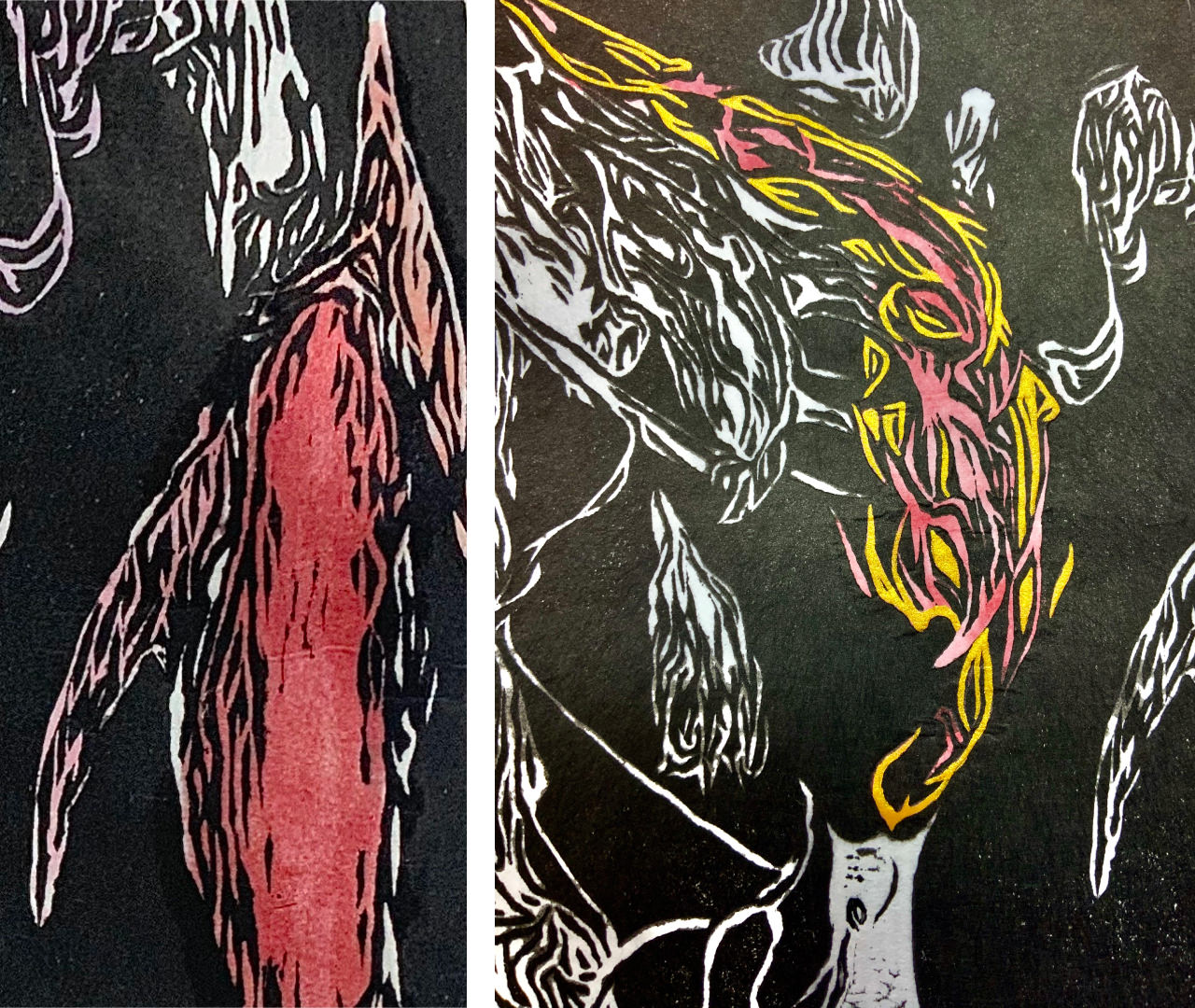 Geht es aber nicht um Auflagenhöhe und absolute Vergleichbarkeit der Drucke, sondern um sehr individuelle Farbholzschnitte, die sogar den Charakter von Monotypien haben, dann bietet sich die Kolorierung NACH DEM DRUCK an. Aber nicht nur Farbe, sondern auch Grautonvarianten lassen eine „Ausschmückung“ des Schwarzdruckes zu … und zwar frei per Hand.