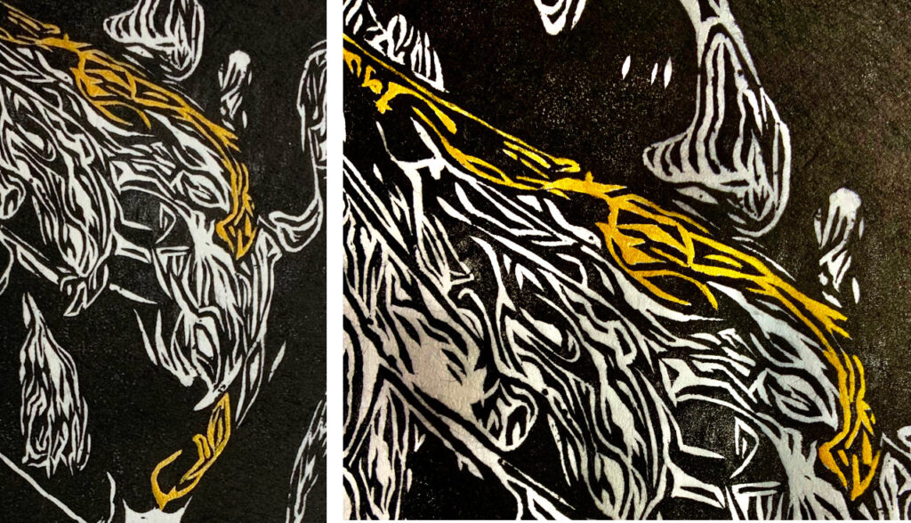 Die ersten Druckergebnisse seinerzeit waren spontan überraschend gut und ich war begeistert von der für mich gänzlich neuen Technik. Nachdem ich mich im Laufe der Zeit (und nach mehreren Kursen, auch in der Westschweiz unter der Leitung von M. Zegrer) besser in diese Art des Holzschnittes eingearbeitet hatte, übte ich auf Anregung Miriams auch einmal einen „cross-over“ aus: Ich färbte eine fertig geschnittene Vollholzplatte mit einer ganz besonderen Ölfarbe ein (Gold), legte dünnes trockenes(!) Washi auf, rieb die Farbe mit dem Baren ein (wobei man hier besser von aufreiben als von einreiben sprechen muss, denn im Gegensatz zur Wasserfarbe dringt die Ölfarbe nicht tief in die Fasern ein), und siehe da: das Ergebnis war wirklich gut!